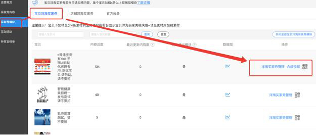 第一步:进入洋淘买家秀后台,选择买家秀模块,在宝贝洋淘买家秀页面,可以看到部分商品有“合成视频”的按钮。