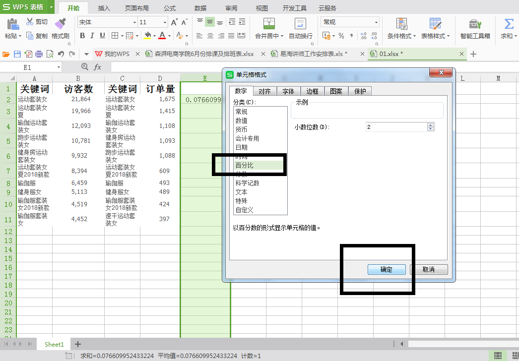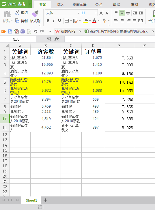 那么会用公式的同学就用表格公式进行计算,不会公式的同学就直接用计算器来算,也是一样的!在这里老师只是算出了这几个宝贝的转化率,那么同学们在操作过程中就要把这些转化率全部计算出来!那么我们通过这些数据的对比就可以发现,”跑步运动套装女”和”健身房运动套装女”这2个词的转化率是最高的,那我们把他标黄!同时把他们的访客数也标黄!